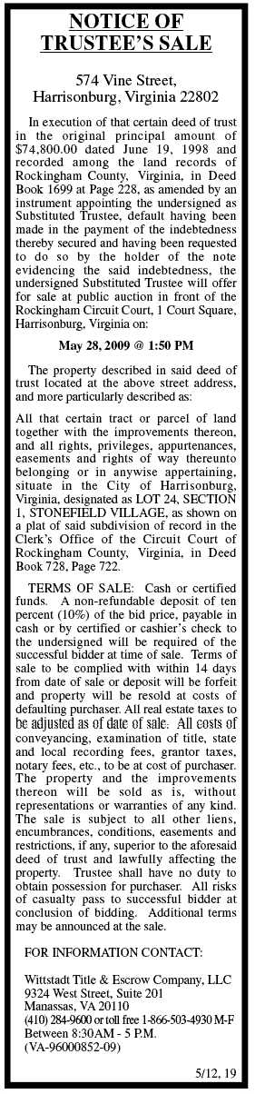 This Trustee Sale is scheduled for May 28, 2009 at 1:50 p.m.
