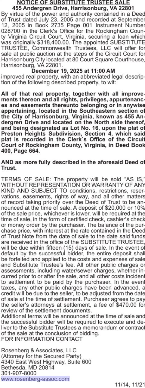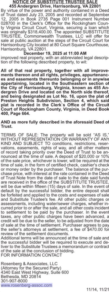 November 15, 2025 by Harrisonburg Foreclosures · Comments Off on [2025-12-19] 455 Andergren Drive, Harrisonburg, VA