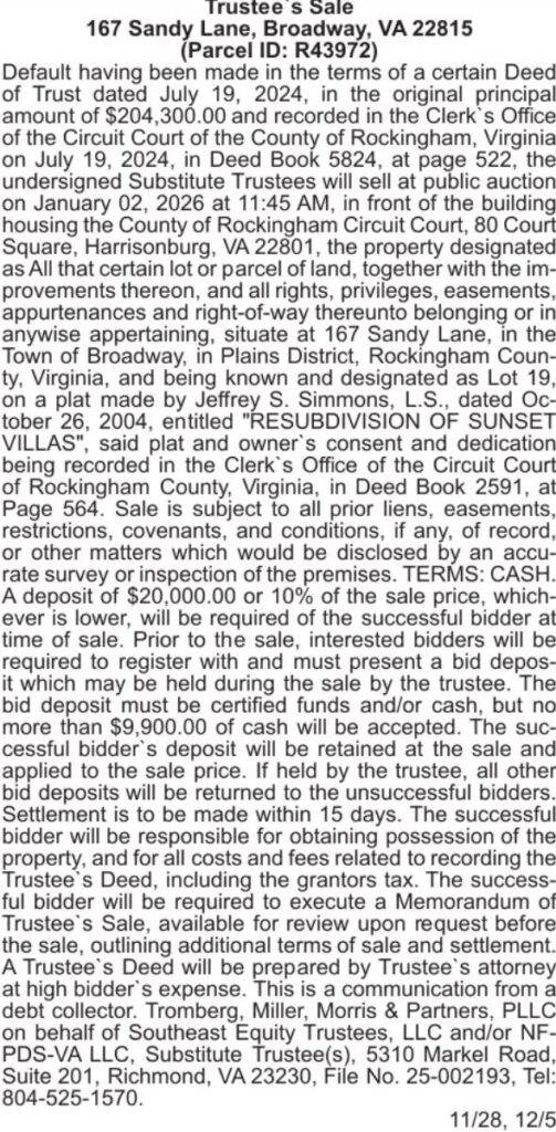 December 1, 2025 by Harrisonburg Foreclosures · Comments Off on [2026-01-02] 167 Sandy Lane, Broadway, VA